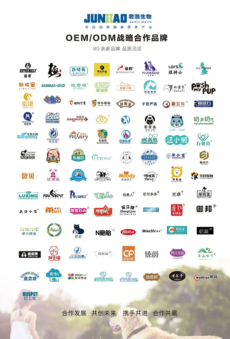 君浩生物以专业严谨、科学的态度做产品,以诚信的理念做品牌。在不断创新的同时严格监督和控制产品质量,从研发、生产、包装、出售,每一个环节都设立严格的监管体系,确保产品的质量安全,为宠物健康提供高效、安全,优质的产品,为每一个合作客户提供专业化的一站式代工服务。