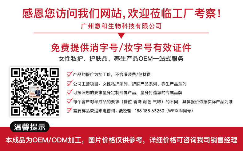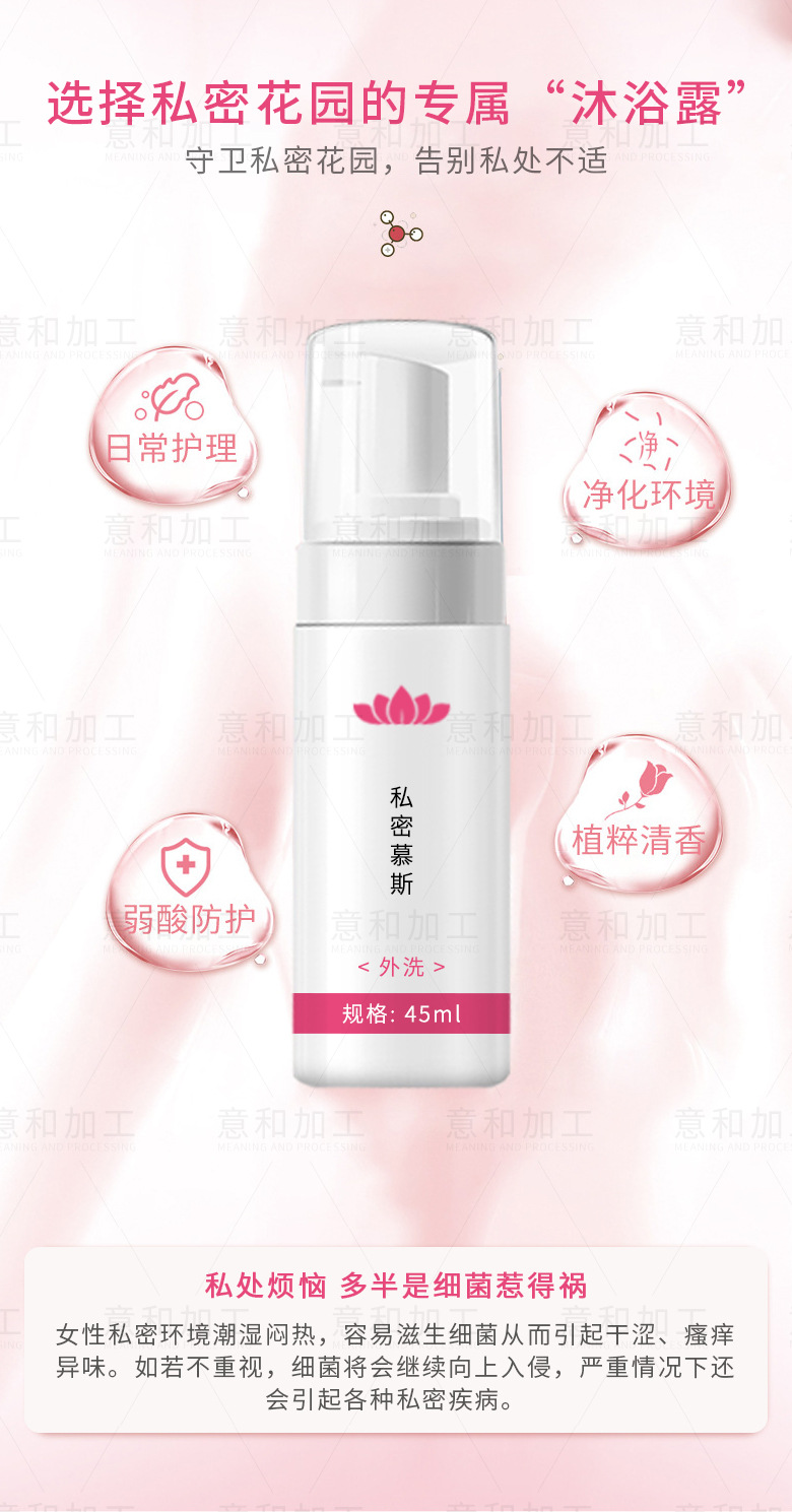 广州意和生物科技有限公司专业承接私密慕斯 妇科清洗外阴私护产品慕斯泡泡外洗摩丝私处抑菌洗液女用厂家代加工,可根据客户区域市场,及消费者习惯,帮助客户了解市场销售情况,帮助分析,为其开发长远性、趋势性的新品牌、新产品,从组方搭配、产品调试、产品定位、外包装设计等进行全案的服务,欢迎咨询合作!