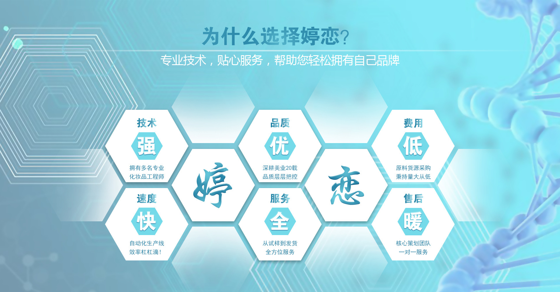 广东婷恋化妆品有限公司座落在现代繁华的国际大都市美丽的羊城广州。是一家专业从事化妆品研发、生产、销售于一体的高科技研发企业,拥有先进的生产设备,高素质的专业研发团队,同时也是国内完全按照药品GMP标准设计的化妆品生产基地的摇篮,公司长期专注于化妆品的产品设计和配方研究领域的研发,一直在致力于打造中国的护肤品民族品牌。力争在产品的设计,配方研究,成品生产,产品理念等方面成为国内化妆品行业的领头羊,进而冲出国门,走向世界。 因为专注,所以专业;因为专业,所以卓越。本公司与国内知名营养生命科学研究所有长期的合作,拥有雄厚的技术力量和科技研发队伍,更得到国外多家公司的个人护理产品的技术支持,因此俏龄密码公司在化妆品的和设计和研发技术上具有雄厚的实力,成熟的化妆品配方。俏龄密码公司将继续秉承不断创新的理念,继续为广大客户提供优良配方和先进技术支持的优质产品。