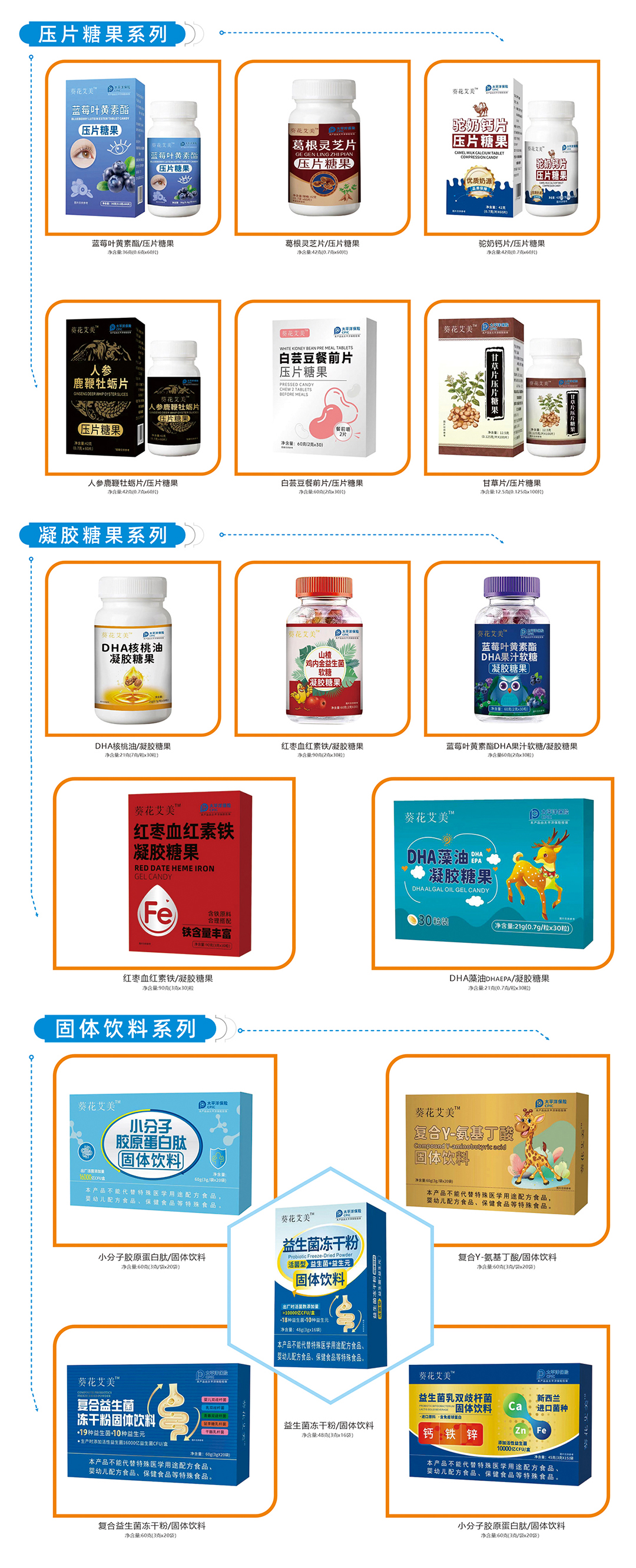 主贴药食同源类所有品种:固体饮料系列、压片糖果系列、益生菌、肽粉、乳清蛋白、乳铁蛋白、葡萄糖电解质、泡腾片、各类钙片、代用茶、药食同源系列、汤剂系列、冲剂系列等。
