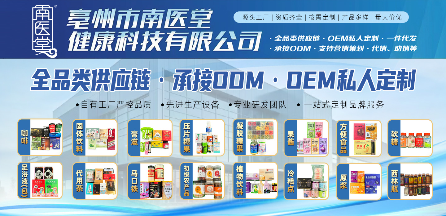 亳州市南医堂健康科技有限公司创于2017年,位于安徽省亳州市,是一家产品研发定制、食品制造业为主的企业。在重点布局的健康产品领域,公司已经成为国内最具影响力的食品定制制造企业之一。