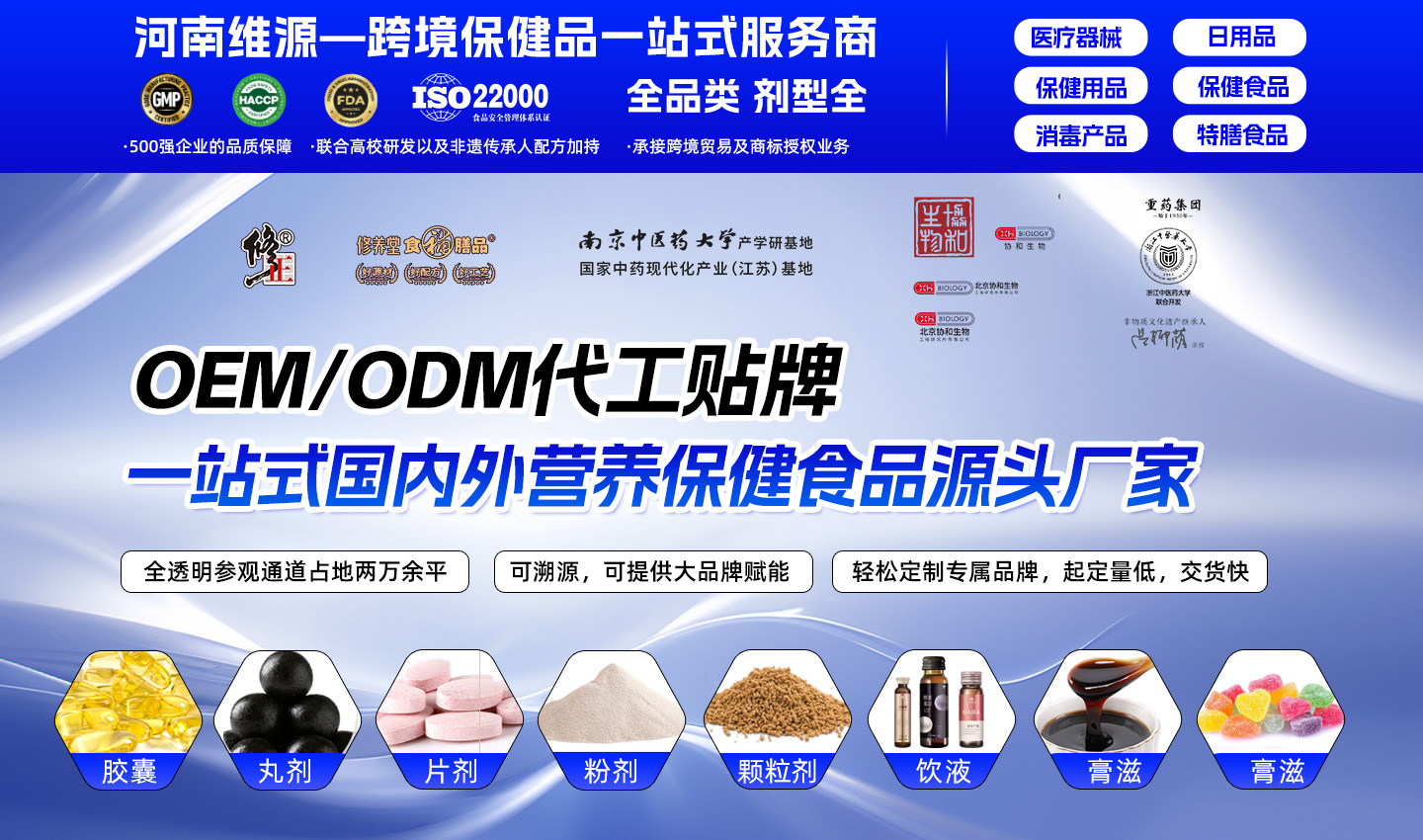 河南维源健康产业发展有限公司,立足全球大健康产业前沿,承接各种进口保健品代工贴牌OEM/ODM!是一家集研发、生产、检测、仓储物流于一体的跨境保健品智造领军企业。已通过FDA(美国)、GMP(欧盟)、ISO 22000、HACCP等国际认证,海外源头自建工厂!可代工产品涵盖:医疗器械、保健用品、消毒产品、日用品、保健食品以及特膳食品等等,片剂、粉剂、颗粒剂、饮液、丸剂以及茶剂等均可,全透明参观通道占地两万余平,可满足各大渠道生产需求,可工厂直播,可溯源,可提供大品牌赋能!