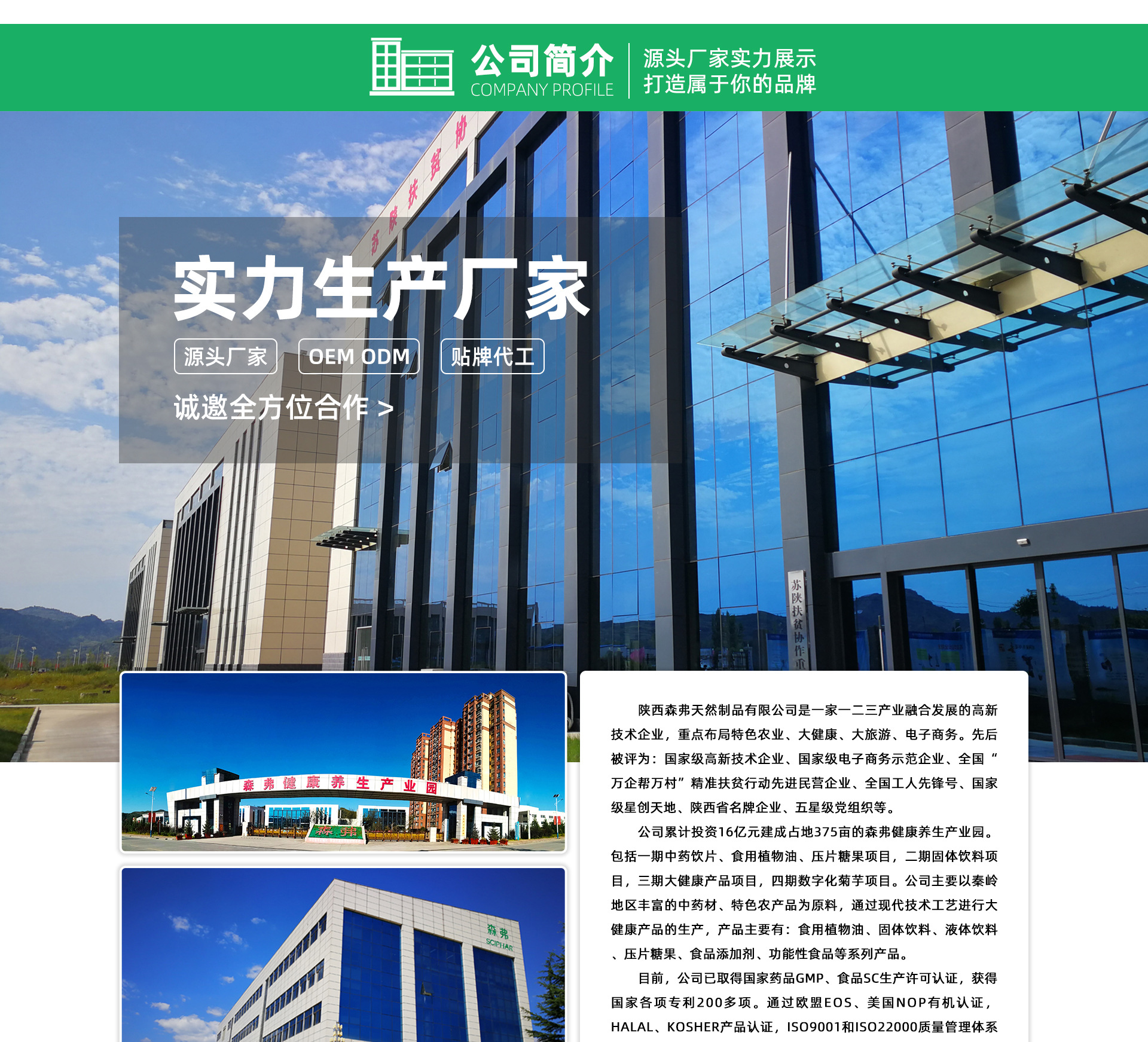 陕西森弗天然制品有限公司累计投资16亿元建成占地375亩的森弗健康衍生产业园。包括一期中药饮片、食用植物油、压片糖果项目,二期固体饮料项目,三期大健康产品项目,四期数字化菊芋项目。公司主要以秦岭地区丰富的中药材、特色农产品为原料,通过现代技术工艺进行大健康产品的生产,产品主要有:中药饮片、食用植物油、固体饮料、液体饮料、压片糖果、食品添加剂、保健食品、功能性食品等系列产品。 目前,公司已取得食品SC生产许可认证,获得国家各项专利200多项。通过欧盟EOS、美国NOP有机认证,HALAL、KOSHER产品认证,ISO9001和ISO22000质量管理体系认证,ISO14001环境管理体系认证,及HACCP食品安全管理体系认证。