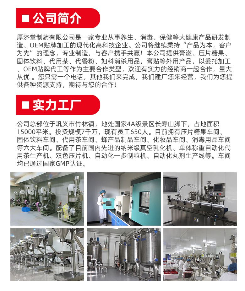 厚济堂制药有限公司是专业从事养生、消毒、保健等大健康产品研发制造,专注于OEM贴牌加工的现代化高科技企业。目前主营产品有预包装食品(固体饮料、压片糖果、代用茶、代餐粉、蜂产品制品)、消毒产品(妇科丸剂、妇科洗剂、凝胶、泡泡洗液、泡腾片)、保健用品(贴剂、膏药、眼贴、足贴、足浴膏、足浴粉)等。 公司总部位于巩义市竹林镇,地处国家4A级景区长寿山脚下,占地面积15000平米。投资规模7千万,现有员工650人。目前拥有压片糖果车间、固体饮料车间、代用茶车间、蜂产品制品车间、化妆品车间、消毒用品车间等六大车间。配备了目前国内先进的纳米级真空乳化机、单体称重自动化代用茶生产机、双色压片机、自动化一步制粒机、自动化丸剂生产线等。车间均已通过国家GMP认证。 公司始终秉承“厚济天下 爱立一方”的态度,在中国传统医药文化基础上,研发出拥有自主知识产权的各种新产品,服务于现代人的生活方式。
