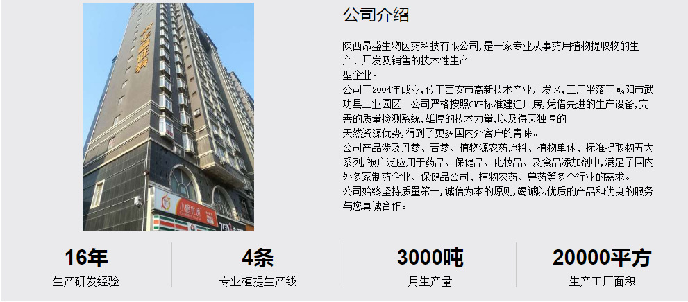 陕西昂盛生物医药科技有限公司,是一家专业从事植物提取物和天然产物有效成分的研发、生产、销售的技术性生产型企业。公司成立于2004年,本部位于西安市高新技术产业开发区。公司下设技术、生产、销售等多个部门,拥有员工近百余人,其中大专以上技术人员占70%以上,是一支具备多学科、高水平的产、销队伍。公司生产基地--陕西昂煦生物科技有限公司,坐落于咸阳市武功县工业园区,占地32亩,年生产能力达3000吨。工厂严格按照GMP标准规划设计,目前拥有多功能提取罐、高效低温浓缩器、喷雾干燥塔、真空干燥箱、层析柱等先进的生产设备。研发中心配备有高效液相色谱、气相色谱、紫外分光光度计、微生物检测等先进检测仪器,以及实验、中试设备。同时与西北工业大学、中国科学院等多所高校和多个国家级科研机构建立了良好的技术合作关系。