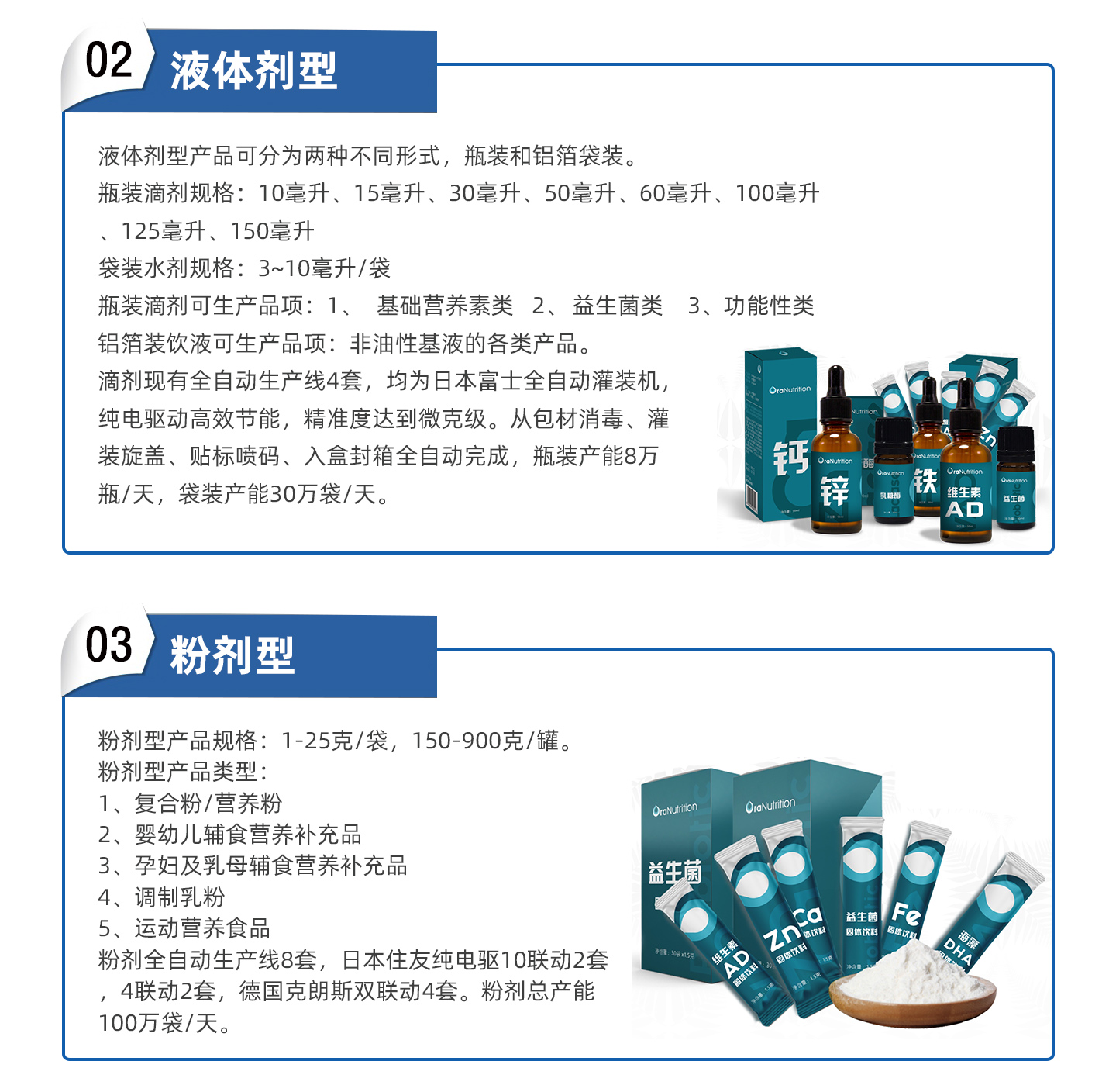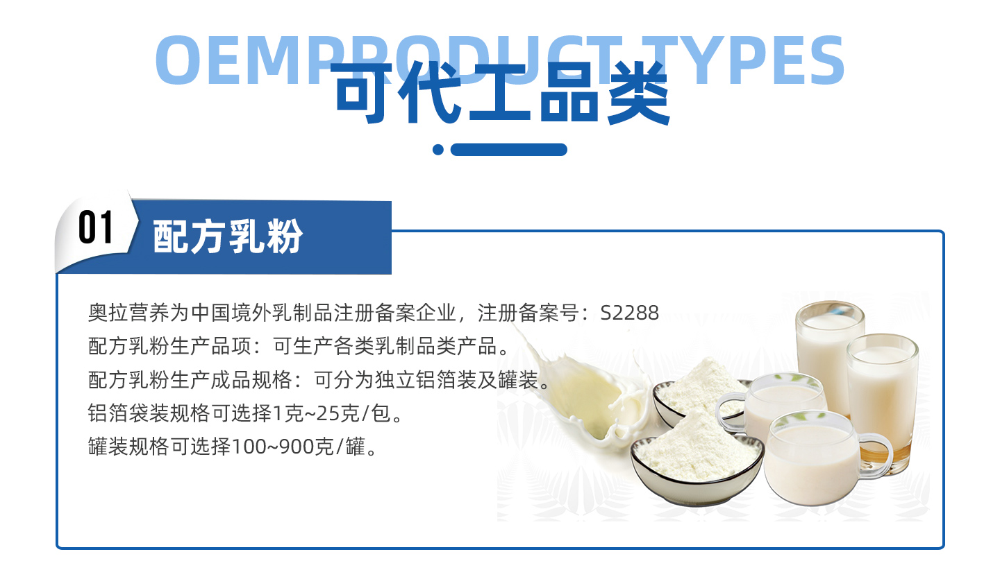 奥拉营养工厂为综合性制造工厂,可生产配方乳粉、滴剂、口服液、片剂、粉剂、软硬胶囊、营养软糖等。