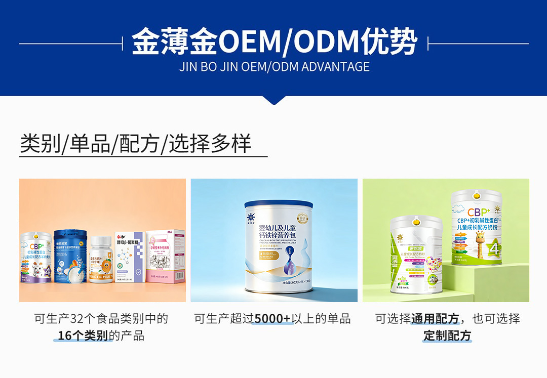 经过二十多年不断创新发展到如今,金薄金是一家集自主研发、生产、检验为一体的高新技术企业,拥有 4个 GMP 生产车间、数十条智能化生产线,年产能超万吨,是国内少数具备“全产品链”生产能力的营养食品企业之一,包括婴幼儿食品、其他特殊膳食用食品(孕妇及乳母营养补充食品、运动营养食品、辅助营养补充品)、调制奶粉、特色乳制品、固体饮料、压片糖果、饼干、方便食品和膨化食品等产品。