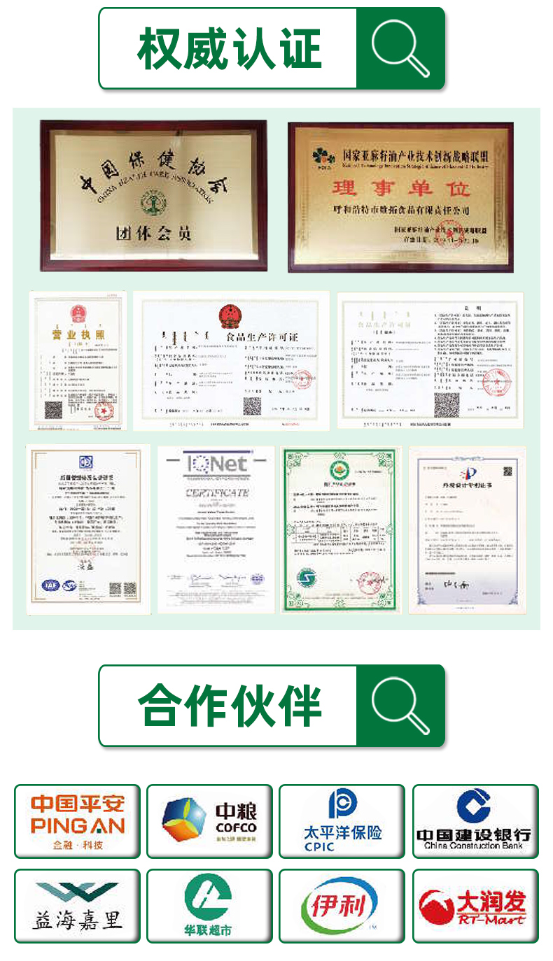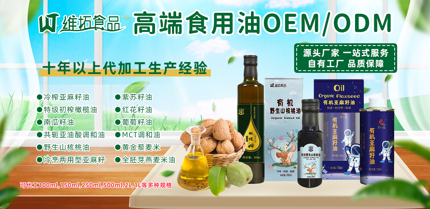 公司主营产品有亚麻籽油、核桃油、葡萄籽油、橄榄油、南瓜籽油、红花籽油、紫苏籽油、全胚芽燕麦米、藜麦米等全系列高端粮油产品,还可承接OEM代加工业务,100ml、150ml、250ml、500ml、1L、2L等多种规格。