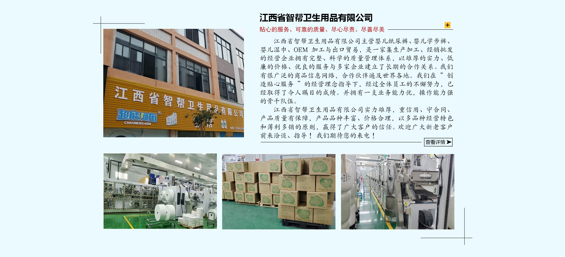 江西省智帮卫生用品有限公司坐落于革命圣地瑞金是一家生产销售的品牌卫生用品企业 欢迎各界人士前来参观!