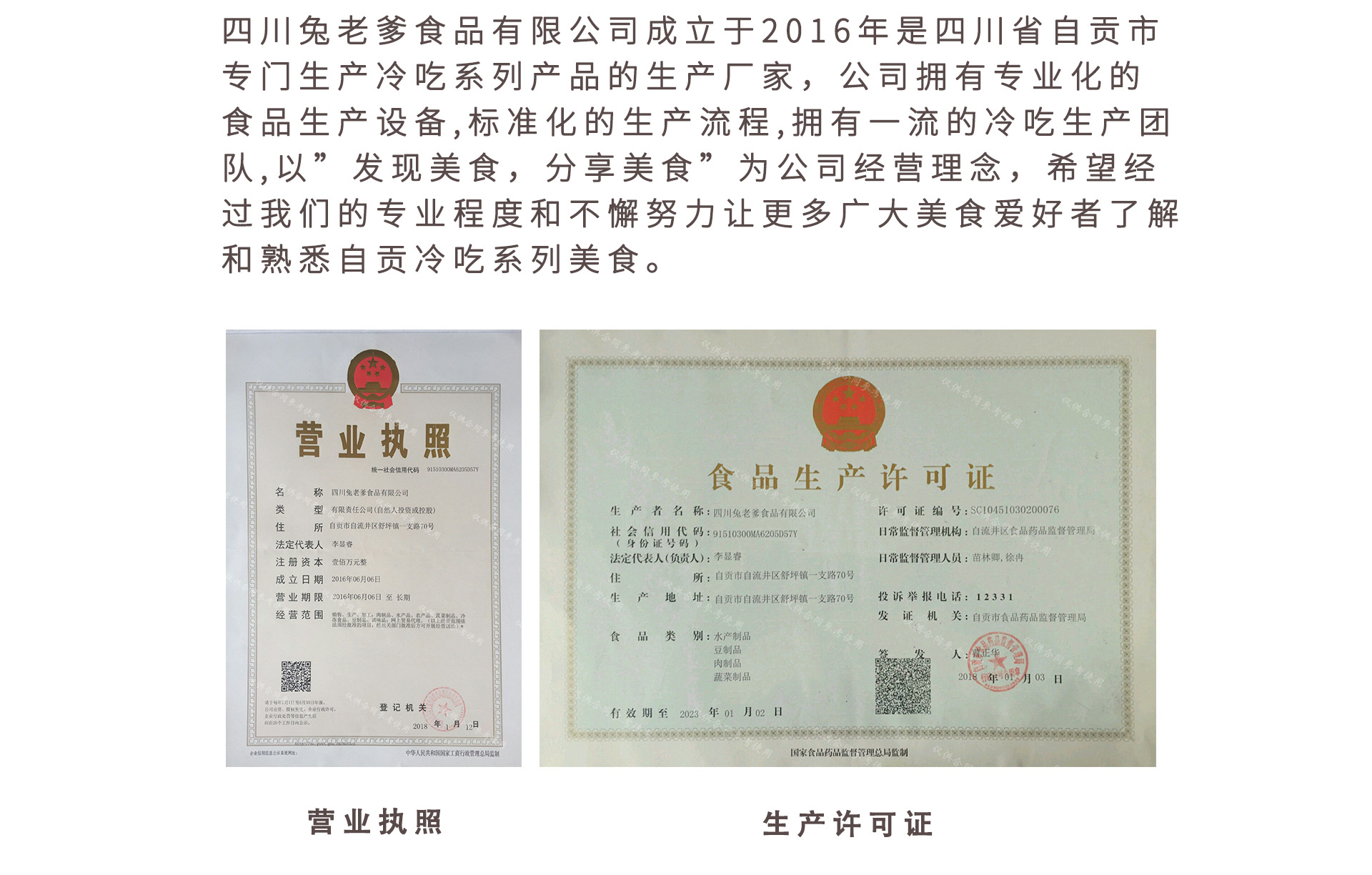 四川兔老爹食品有限公司,成立于2016年,公司位于四川省自贡市自流井区食品工业园区,是一家集开发、销售、服务为一体的新型食品公司,拥有专业化的食品生产设备,标准化生产流程,年产值5000万元休闲食品生产能力。 公司拥有一流的研发团队,现有在职员工60名左右,旗下拥有“兔老爹”、“舌意”、“汪大少”,“诱货”等一系列快消食品品牌。 公司目前也积极开展代加工业务,与多家线上线下各大平台的优质商家签有代加工的委托协议。