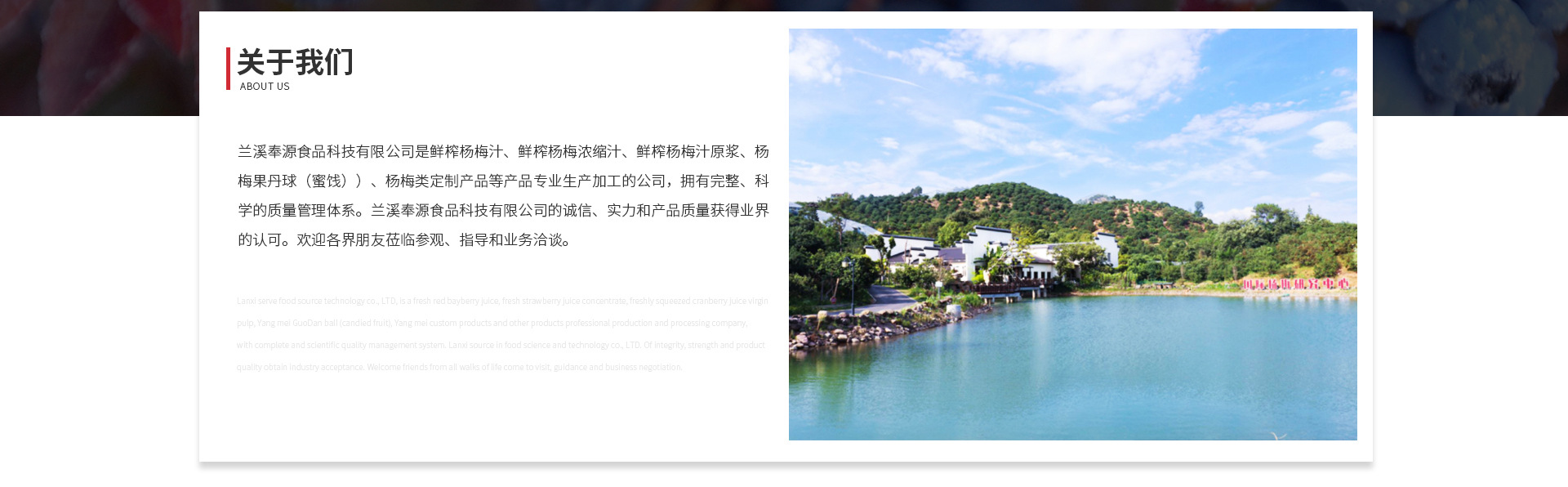 兰溪奉源食品科技有限公司是一家集杨梅种植管理、鲜果采摘和杨梅深加工制品研发、生产、销售为一体的有限责任公司。 公司拥有30多年的杨梅种植技术和2000多亩的杨梅种植基地;专业种植技术人员30多人;杨梅种植过程当中全程不使用农药、化肥。是国家地理标志农产品、国家绿色食品。 深加工体系于2019年01月份创立,拥有目前国内最新进的低温鲜榨技术,与国际杨梅研究中心、浙江省农科院等顶级科研单位战略合作,由其提供产品研发及技术支持。目前所生产的冰鲜杨梅汁及浓浆产品已获得国家绿色食品认证。虽然生加工企业成立时间很短,但在业界异军突起,势头强劲;已引起了业内广泛的关注和强烈的反响。
