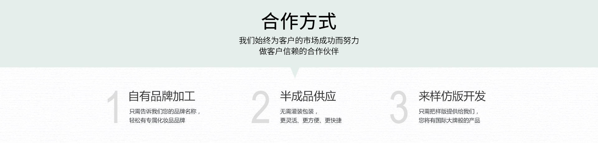 本公司是一家专业的护肤品OEM/ODM贴牌代工厂家,拥有GMP车间净化10万级,全封闭生产车间配以高级空气净化系统及消毒系统,灌装设备应用气动装置,无接触无菌操作。多条生产线满足不同需求量的生产,拥有高效的产能,可满足巨大的生产需求,严格按照国家化妆品生产标准要求设计和运作,有多名优质专业的研发人员,生产基地和灌装线,不断的研发各种新颖、独特、安全、高效的功效性产品,根据市场的各种需求为您量身定做配方,按您的要求进行灵活的配方设计,生产出高水准的个性化产品,为您灵活运作市场提供有力的保障。 竭诚欢迎广大新、老客户来电洽谈合作!