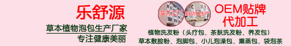 乐舒源拥有10年草本植物研发、生产经验,专注于草本植物养生调理亚健康。车间具有优越的生产加工环境,具有现代化的包装设备,独立的产品研发实验室,雄厚的研发服务团队和贴心的售后服务。 专业生产:泡脚包、泡脚粉、泡澡包、泡澡粉(男女泡澡包、小儿泡澡包)、泡浴包、泡浴粉、熏蒸包(头部熏蒸包、身体熏蒸包、脸部熏蒸包、私处熏蒸包等)、敷粉(敷脸粉、敷身体粉)、敷包、洗发粉、洗发包、草本茶等草本植物泡包(粉).