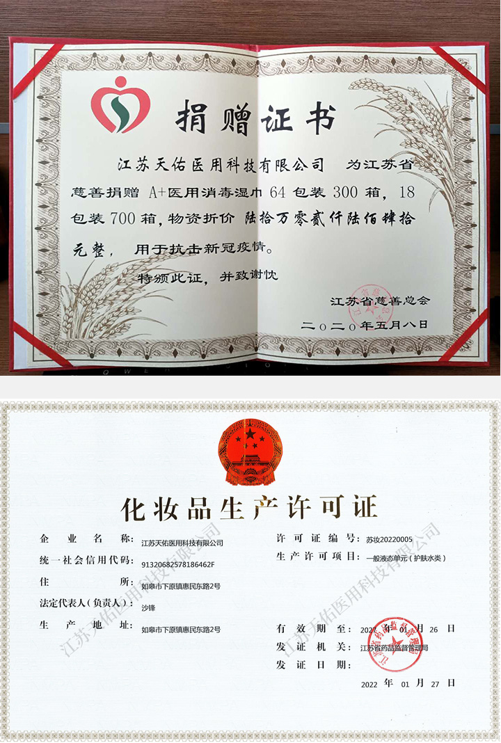 公司拥有消毒产品许可证,化妆品生产许可证,FDA、CE、EPA、ISO9001、13485等多项许可认证,产品通过SGS、广州微生物所等多家专业检测机构检测。
