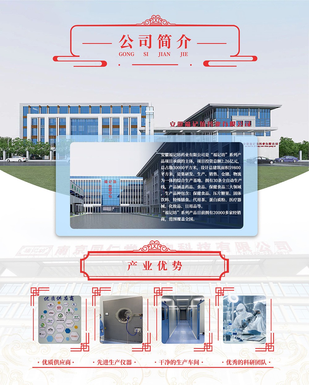 福记坊核心优势:30 高级研发人才、32类产品种类、800 可生产产品、45000㎡自主生产车间、30000㎡无菌标准车间、2000 经销商、3.6万㎡生产基地、30 进口生产线、10万 日产量、10万级净化车间、100 国食健字批文、100 食健字批文、10余所研发合作大学(徽中医药大学、中国中医科学院等大学),企业员工300 。 福记坊承接贴牌代加工,合作品牌:仁和,同仁堂,广药白云山,修正,江中等。