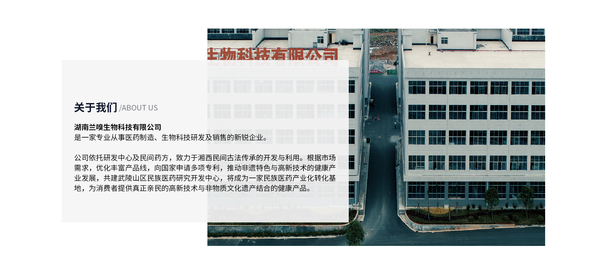 湖南兰嗅生物科技有限公司 创建于2019年2月,是一家专业从事医药制造、生物科技研发及销售的新锐企业。 公司依托研发中心及民间药方,致力于湘西民间古法传承的开发与利用。根据市场需求,优化丰富产品线,向国家申请多项专利,推动非遗特色与高新技术的健康产业发展,共建武陵山区民族医药研究开发中心,将成为一家民族医药产业化转化基地,为消费者提供真正亲民的高新技术与非物质文化遗产结合的健康产品。