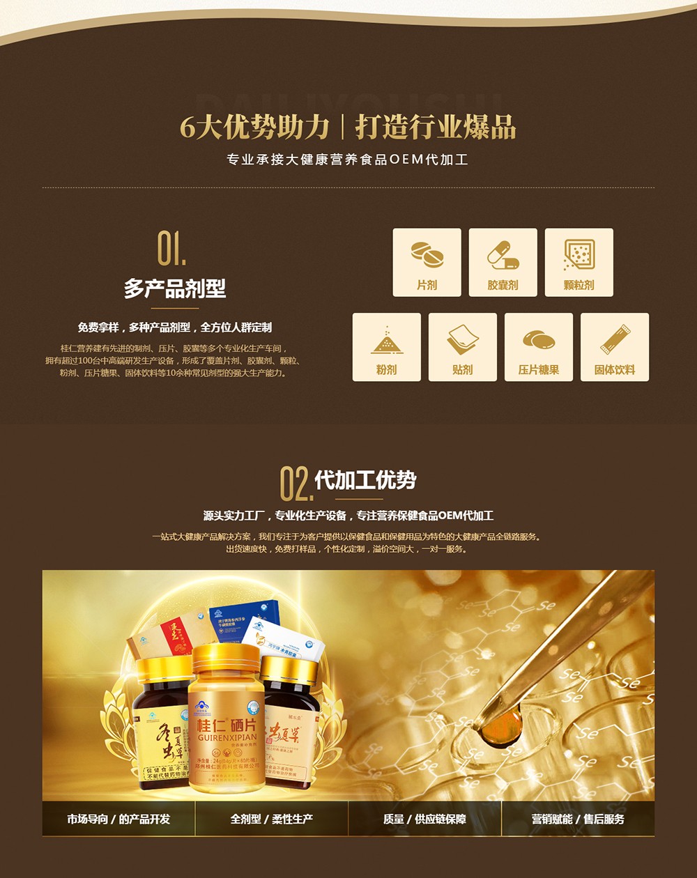 桂仁营养现有20余项保健食品注册批件,致力于为客户提供包括市场渠道分析、产品研究与开发、生产与包装、质量管理以及营销支持等一站式大健康保健食品智造营销解决方案服务。并以优质的产品,高品质的服务,助力每一位合作伙伴赢得成功。