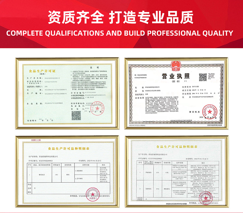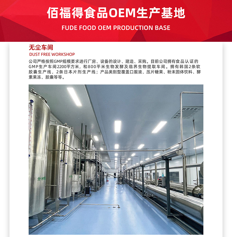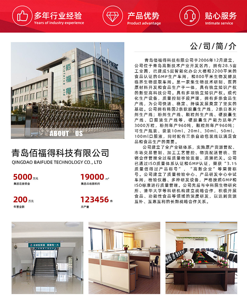 青岛佰福得科技有限公司于2006年12月建立,公司位于青岛高新技术产业开发区内,拥月28.5亩工业园,已建成5层智能化办公大楼和2200平术的食品认证的GMP生产车间,和800平米生物发酵及临界生物提取车间。是一家集生物技术研制、医药原材料开发和食品生产于一体,具有独立知识产权的新型高科技公司。具有多项独立知识产权。现代化生产设备,质量控制手段严谨,拥有多条食品生产线,为公司快速、稳定、持续发展奠定了坚实的基础。公司拥有韩国2条软胶囊生产线、2条日本片剂生产线;粉剂生产线、颗粒剂生产线、硬胶囊生产线、口服液生产线等,硬胶囊生产能力达年产3000万粒,粉剂年产960吨,颗粒剂年产960吨;可生产瓶装、袋装10ml、20ml、30ml、50ml、100ml口服液,同时配有三条自动包装线以满足食品和食品生产的需要。