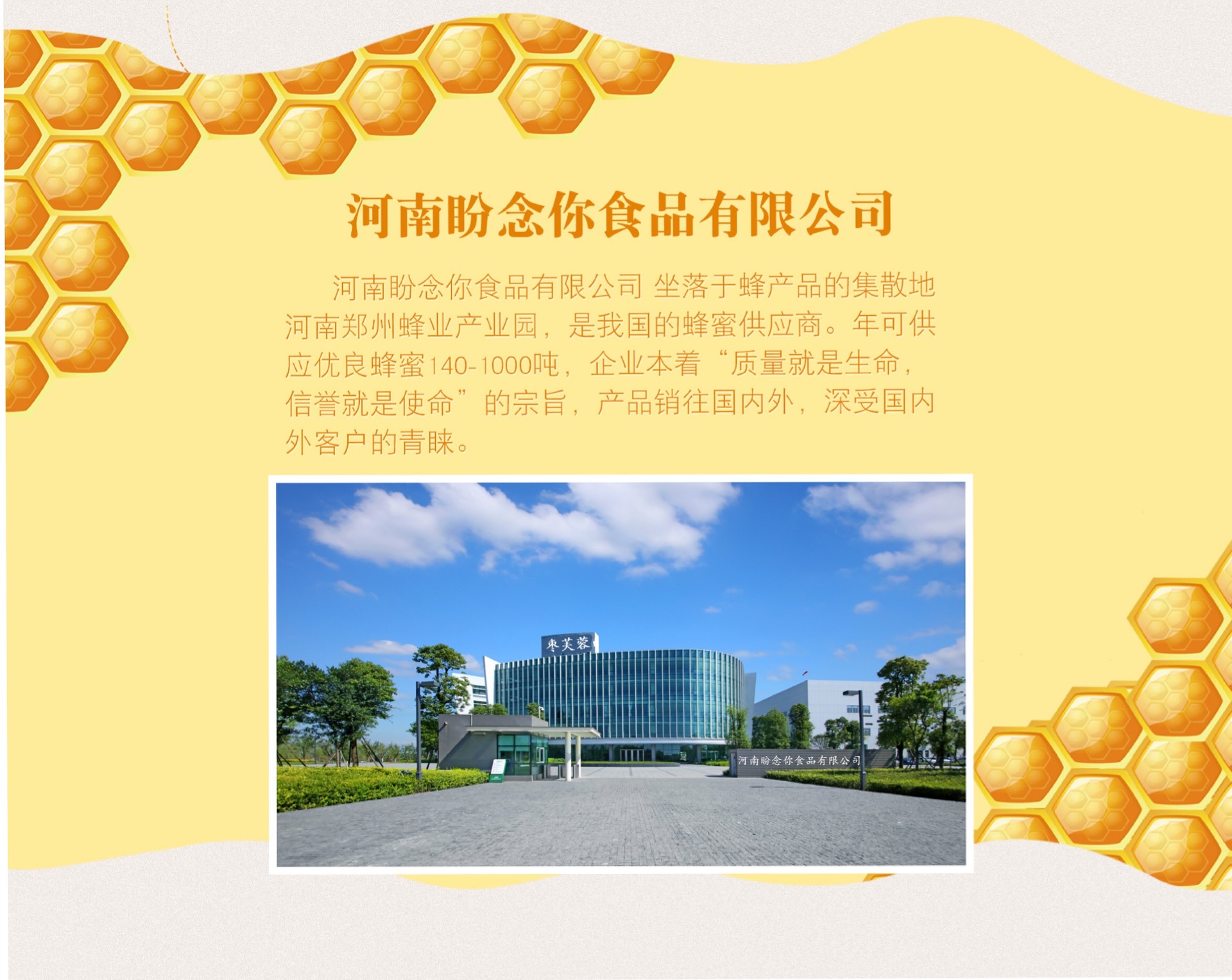 河南盼念你食品有限公司坐落于蜂产品的集散地,河南郑州航空港经济综合实验区,是我国专业的蜂产品供应商。年可供应优质蜂蜜140~1000吨,蜂王浆10~50吨。企业本着“质量就是生命,信誉就是使命”的宗旨,产品销往国内外,深受国内外客户的青睐