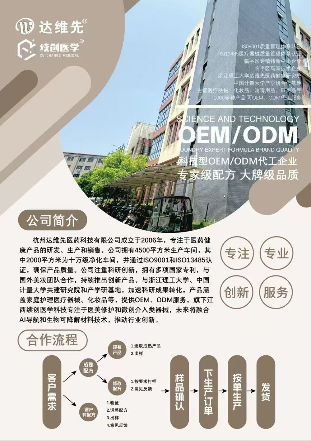 杭州达维先医药科技有限公司成立于2006年,是一家集研发、生产与销售于一体的医药健康科技企业。公司坚持“匠心领先,至善至美”的理念,专注于医疗器械、化妆品等领域的创新与生产,提供专业的OEM/ODM一站式服务。