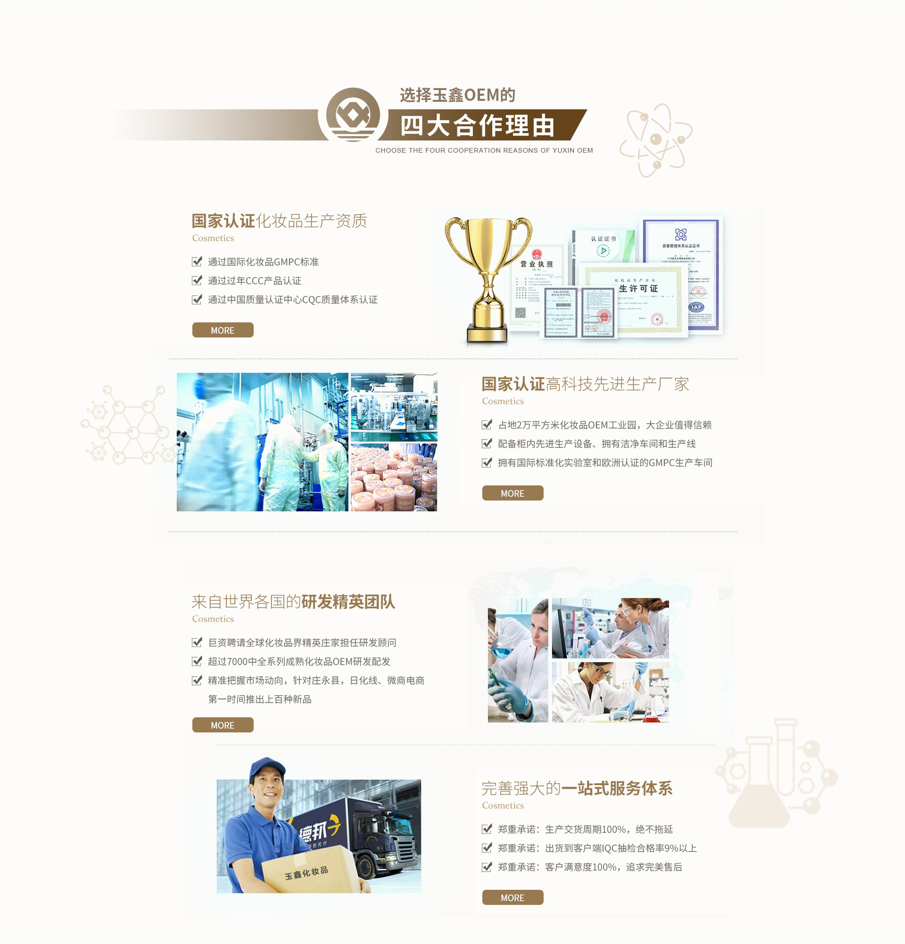 广州玉鑫集团为专业化妆品OEM/ODM加工企业、是化妆品品牌输出基地,已为2000多个品牌商提供服务。拥有2.4万平方米的大型OEM工业园,并配备国外先进生产设备,拥有完整、科学的质量管理体系。广州玉鑫集团的诚信、实力和产品质量获得业界的认可。欢迎各界朋友莅临参观、指导和业务洽谈。