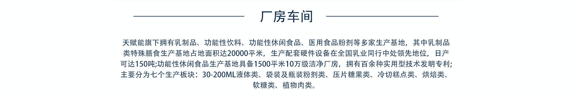 极美(天津)功能食品研究发展中心(有限合伙)是功能食品、特殊膳食、蛋白棒、蛋白肉等产品专业生产加工的公司,拥有完整、科学的质量管理体系。 2000平米的10万级中试车间,20000平米的功能食品和饮品生产线,拥有多条液体生产线、粉剂生产线、压片糖果生产线、蛋白棒生产线、凝胶糖果生产线、夹心饼干生产线、冻干产品生产线、代用茶生产线。 极美共享工厂依托天赋能集团,拥有中国科学院、中国中医科学院、食品营养与安全国家重点实验室、北美功能食品研究院等科研单位的技术支持,拥有权威专家及学者、医学博士、国家级高级营养师的研发团队。 极美(天津)功能食品研究发展中心(有限合伙)的诚信、实力和产品质量获得业界的认可。欢迎各界朋友莅临参观、指导和业务洽谈。
